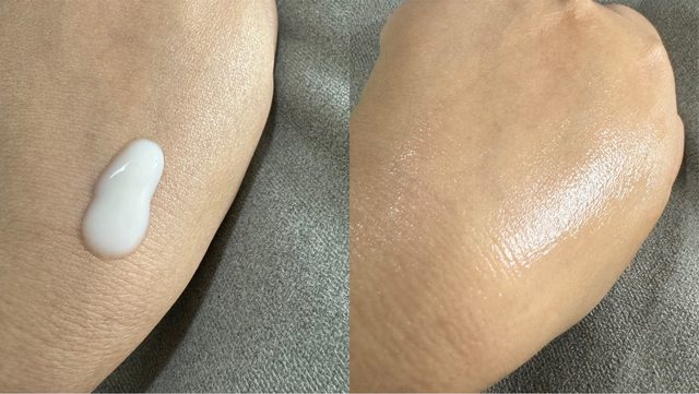 質地擠出來是清透的乳狀,抹開延展性很高,在皮膚上很快吸收