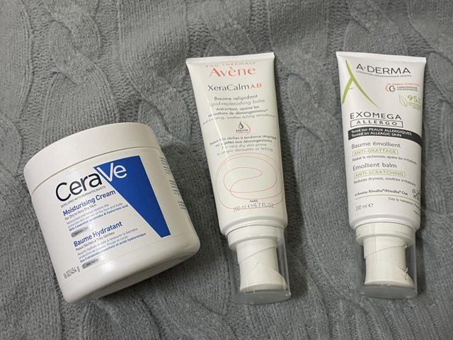 從左邊到右邊分別是CeraVe長效潤澤修護霜、雅漾舒緩乾癢霜、艾芙美舒敏霜