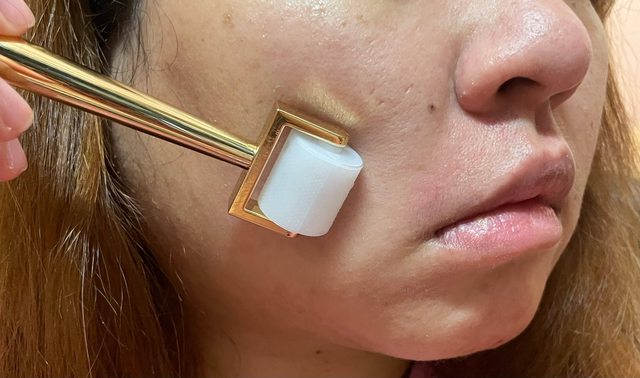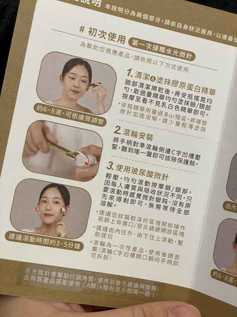 就是先在臉上擦膠原蛋白精華安瓶後再用玻尿酸製成的滾輪滾臉部和頸部