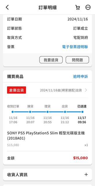 【附 註】:2024 11/16 PCHOME購入,2024 11/17到貨,交易完成後提供購買證明以