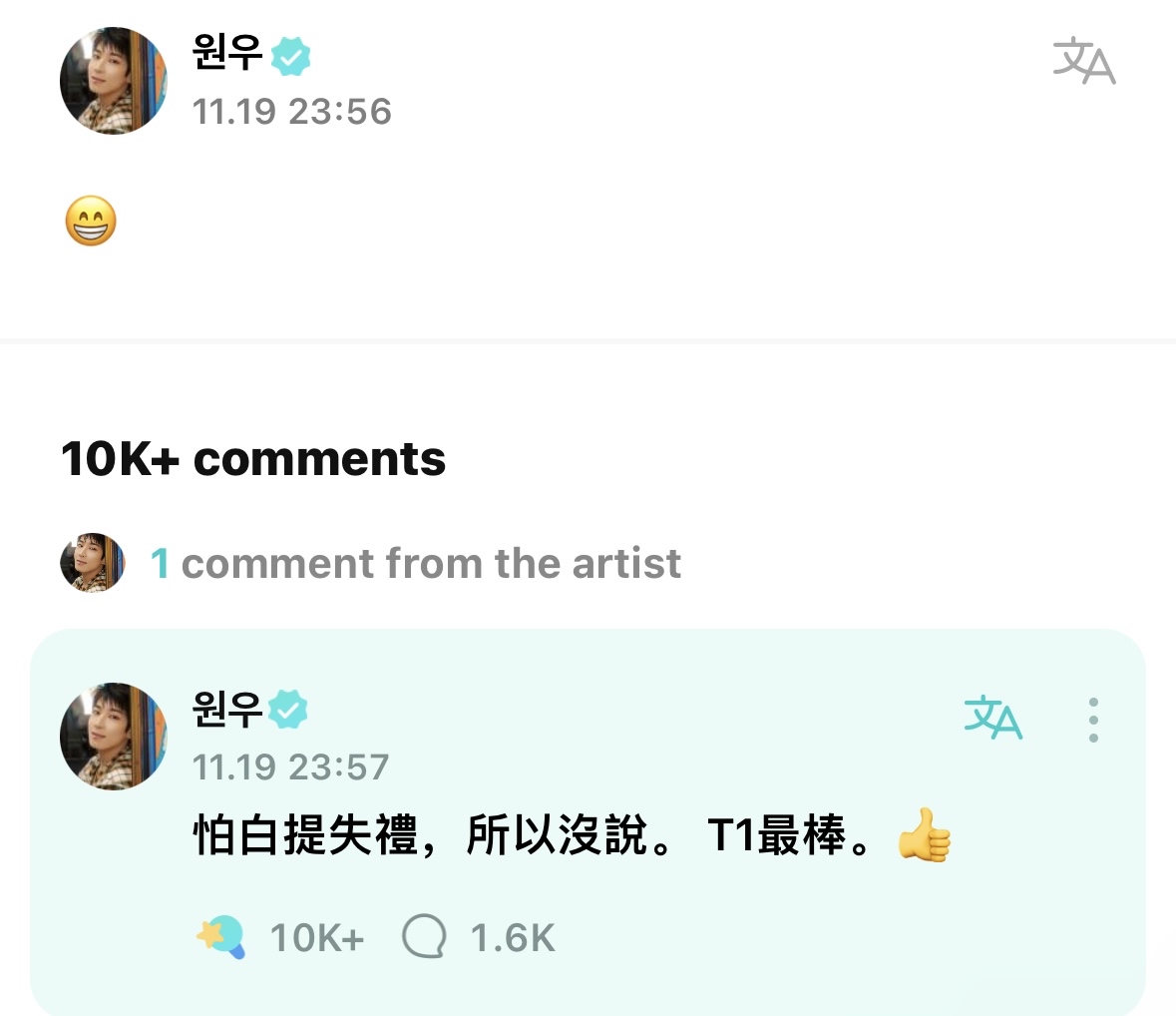 → Cchild: 喔喔 看到超多粉絲在謝謝T1 原來是這樣== 123.193.83.11 11/20 00:53