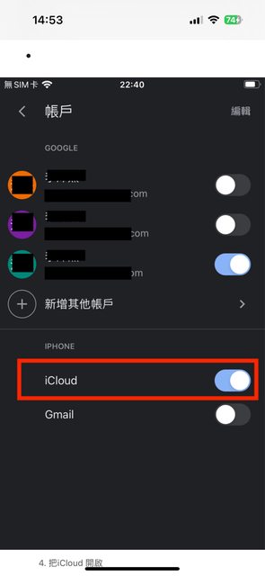 網上有教學是要從Google日曆—設定—管理帳戶—iPhone icloud 打開即完成設定!