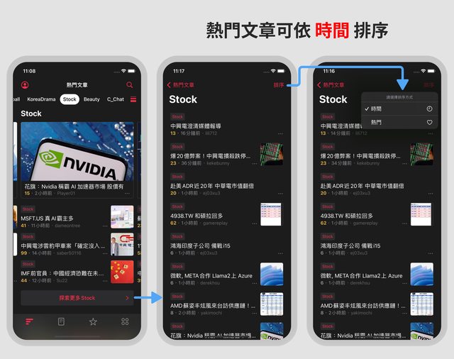 在各板的熱門文章分類裡,右上角多了「排序」的功能