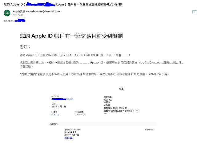推 neomaster : 一看就假 apple 會用hotmail 寄信給你? 08/07 19:49