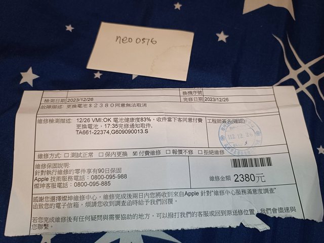 2023.12.26燦坤授權維修中心更換原廠電池,全機檢測功能正常,零件保固三個月