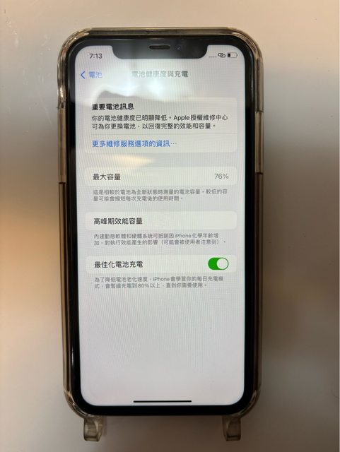 物品狀況:二手,電池健康度76%,沒換過電池及做其他維修,使用時都有貼保貼、螢幕