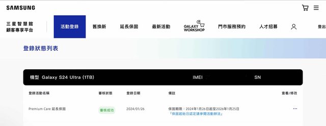 購買來源:三星智慧館 NCC 認證:CCAK235G0160T6 盒裝內含:附有原完整外盒與配件,已貼原廠保護貼,附上 MagSafe 可磁吸充電保護殼 購買日期:2024/01/26 保固日期:2026/01/26(Samsung 原廠延長保固 2 年)