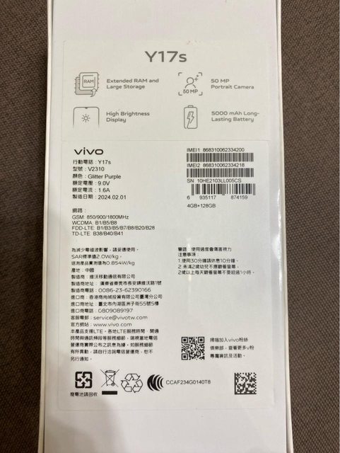 標題[賣/台中/面交] 全新 Vivo Y17s 4G/128G 霓虹紫
