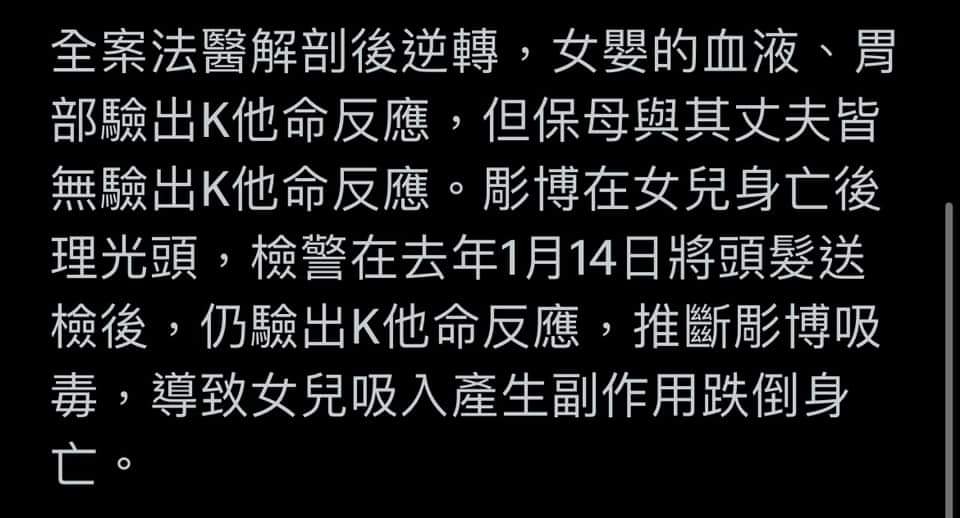 → jimmy911112 : 去找其他原因,K他命吸食會猝死,在女嬰“胃”內驗 07/26 16:53