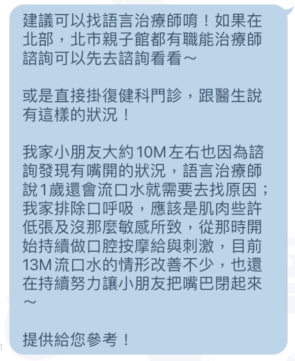 → q169 : 我家剛好相反,2歲多很愛講話張嘴動個不停,就會有08/16 22:03