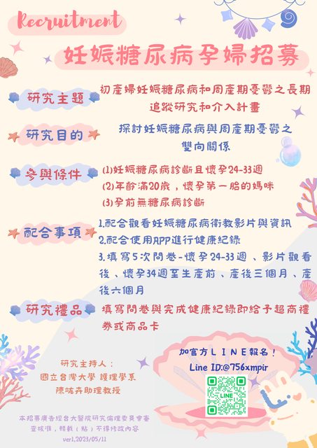 我們接受科技部的委託,進行「初產婦妊娠糖尿病和周產期憂鬱之長期追蹤研究和介入計