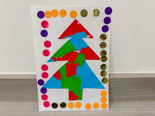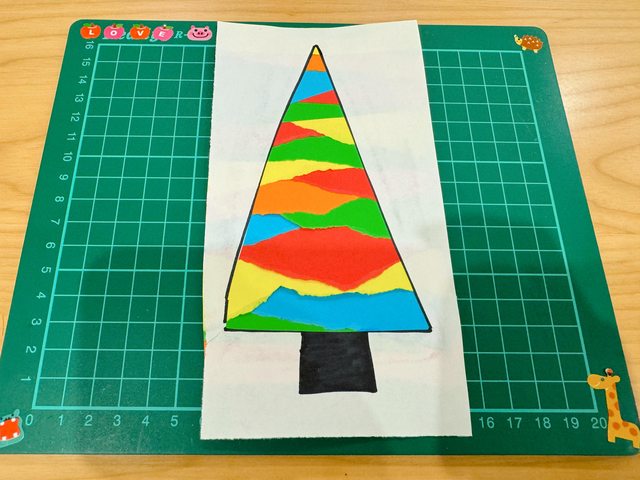 在聖誕樹中間貼上撕或剪下的色紙