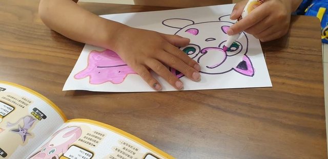 或是做他喜歡的主題的著色紙,這張照片是我認真的幫百變怪著色,他也學我的手法認真
