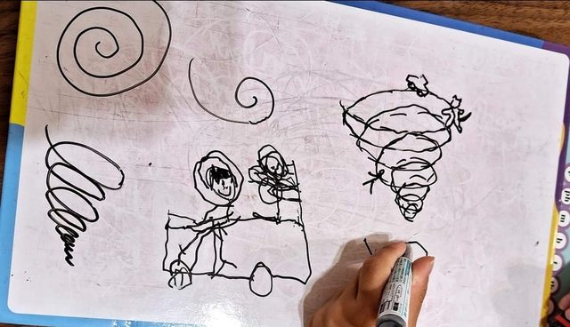 比如畫龍捲風,問他「有什麼東西被龍捲風刮走了?」他可能覺得有趣就想要完成這個故
