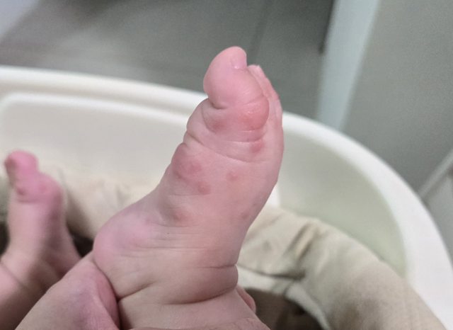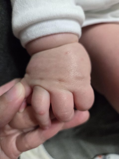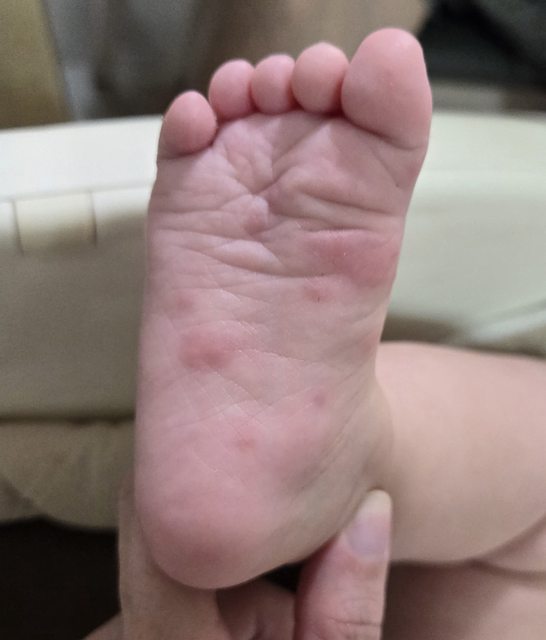 4/4晚上睡前寶寶腳上出現幾顆紅疹(跟原po寶寶一模一樣)