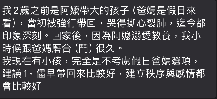 FloraPiglet : 父母一方只要請一天把寶寶送回公婆家照顧一週、甚 04/09 13:21