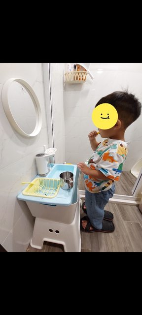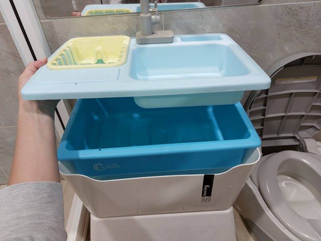 因為抱小孩洗手超麻煩又很累....(以下省略敘述各種不適合我們家的方案) 好處: 1.小孩練習自己看著鏡子刷牙、洗手都不用抱也不用嚕椅子 2.小孩自己操作很有成就感,比較主動配合 3.不用站小凳子,也不會壓到陶瓷洗手槽比較安全 4.底下小凳子可以照小孩身高置換 5.不用接水管,可以整盆移動(要帶去露營也是可以的....) 直接在左邊洗手槽注入淨水即可 6.污水直接進到下方污水盒,不用開,瞄一下就知道要不要倒污水了 感謝改造ikea廚房洗手槽的媽咪,妳是我的謬思女神 分成兩大部份: A洗手盆改造 B水龍頭改造 ---------洗手盆-------- @材料: 盟石變溫洗手槽(此款好像斷貨了) 耳溫槍套 粗吸管 螺絲釘、老虎鉗、瓦斯爐(加熱鑽洞) 熱熔膠槍 IKEA洗澡凳(墊高用) KEYWAY大比利整理收納盒(污水盒) @步驟: (淺藍為洗手槽、深藍為淨水盒、白色為污水盒) https://i.imgur.com/dvGkC7s.jpg