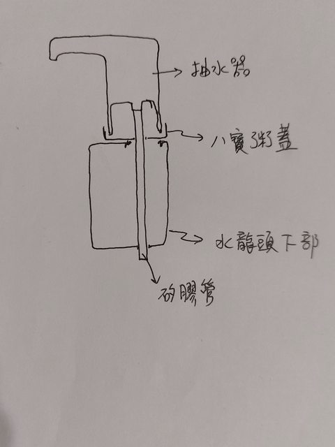 -------水龍頭改造--------- @材料: 抽水器 原本玩具附的水龍頭組 八寶粥塑膠蓋子 熱熔膠槍 鑽洞剪洞工具(我用美工刀和斜口鉗) 本來的抽水馬達和電池都是在水龍頭下部,電池盒僅有簡單的防水圈,幾乎整個電池盒下 部都是泡在水裡,安全堪慮。 啟用沒多久小孩把水龍頭玩壞了,就順勢改造。 單純把抽水器放在水槽上也是可以,但非常不穩,三不五時就被玩到栽進水槽,本來的位 置也有個洞,看起來很空虛(?) 因此把水龍頭拔掉,留下下半部當底座,想辦法把抽水器黏上去就是了。 因為步驟比較繁瑣隨意,寫了大概也變流水帳看不懂 構造如圖 https://i.imgur.com/uz1PC1X.jpg