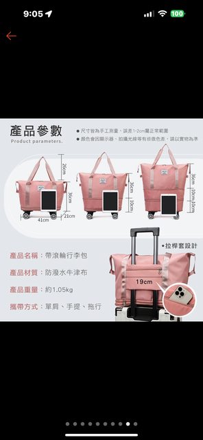 包包掛著輪子著地長這樣(請看後面綠色包包)