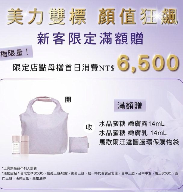 6500就可以送這組新客限定滿額贈 內容物有 水晶蜜糖 嫩膚露14mL、水晶蜜糖 嫩膚乳 14mL、馬歇爾汪達圖騰環保購物袋