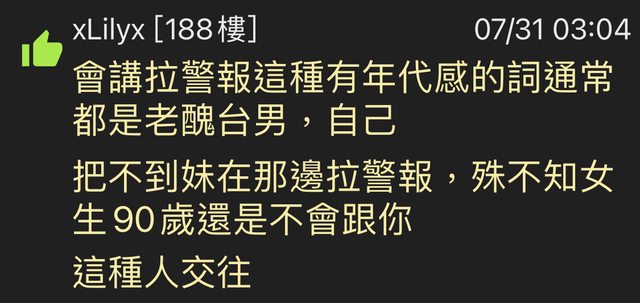 推 xLilyx : 會講拉警報這種有年代感的詞通常都是老醜台男,自己 07/31 03:04
