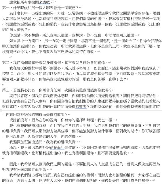 她似乎認為我該自動理解、修正,並認為聊天是為了開心,若過程不開心就不必聊了。我