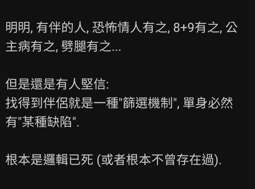 → Ripper : 看起來像是被迫單身…周遭也有這樣的朋友,她們也 02/04 01:02