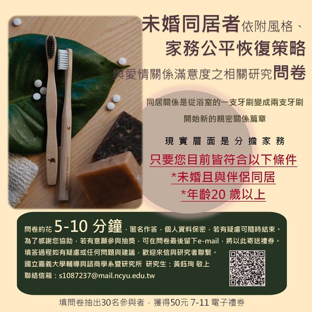 個研究是為了解未婚同居者依附風格、家務公平恢復策略與愛情關係滿意度的現況與相關