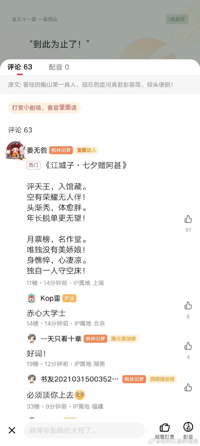 姜望很是認真地道:“若要以他為餌,是否應當提前告知他呢?就像告知冠軍侯一樣 ......我沒有質疑各位大宗師的意思。只是鬥昭乃當世真人,當有幾分真自由?況乎天下 如局,人力有缺,下棋難免有疏忽之時,而於棋子,卻是死生一刻。鬥昭背後,乃是大楚 三千年世家,司閣主不可不察。” ... 又補充一句:“宋菩提已經來了!” 姜望一時沉默。 鬥昭來禍水也這麼不純粹嗎? 合著這次這麼多人來禍水,全都是長輩安排,只有我和祝師兄是真心修煉? ... 曾經的搬山第一真人,現在的血河真君彭崇簡,仰頭便倒! -- 1.老餌真人肺腑之言QQ 2.又來一個真君,血河宗是不是會有半步超脫的大佬出現?XD 3.下章肯定要反轉了吧XD 要不要猜一下會有誰領便當? -- https://reurl.cc/Akd2Nd 赤心巡天設定整理 1.有人物忘記請去[角色]查詢,設定相關則是[設定] 2.若發現沒有整理進去的資訊,或者有疑問,歡迎於[留言板]留下訊息 3.想長期加入編輯可以站內信或email給我 -- ※ 發信站: 批踢踢實業坊(web-ptt.tw), 來自: 140.128.137.22 (臺灣) ※ 文章網址: https://web-ptt.tw/CFantasy/M.1692678020.A.4B9
