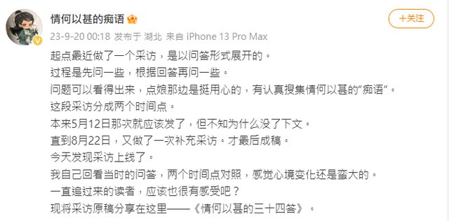 貼一下甚大的微博,起點採訪~