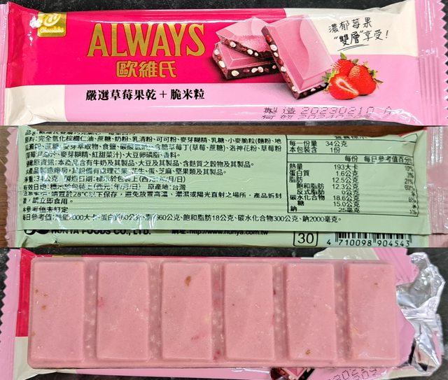 單件半價活動到9/5,效期2024/2,是帶微酸的草莓口味吃起來不會太甜,脆心比例也不