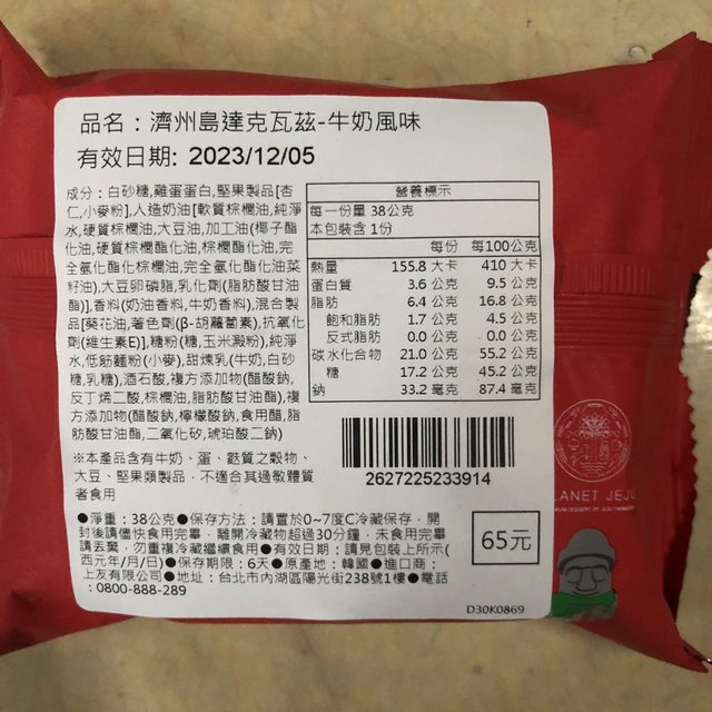 【商品名稱/價格】:濟州島達克瓦茲-牛奶風味/65元