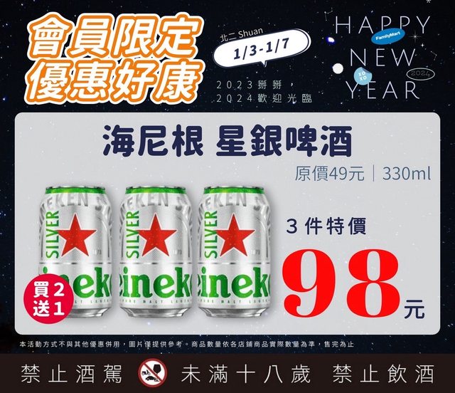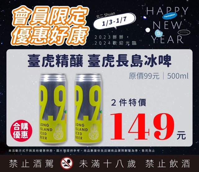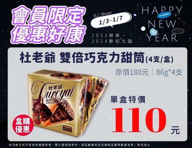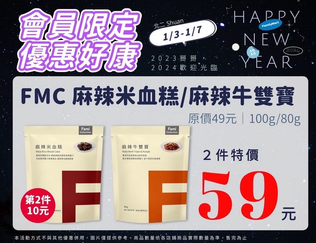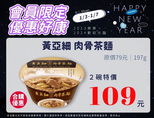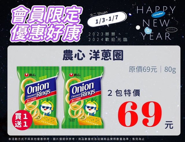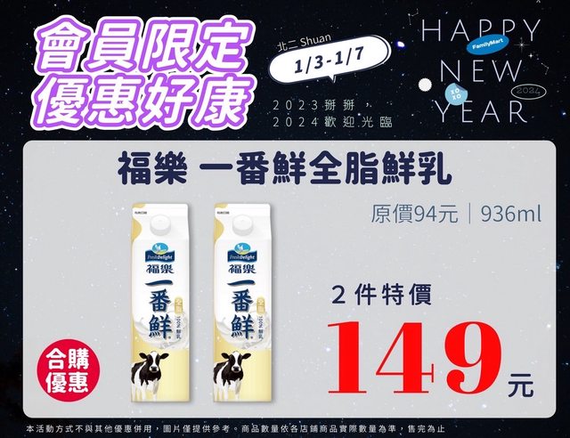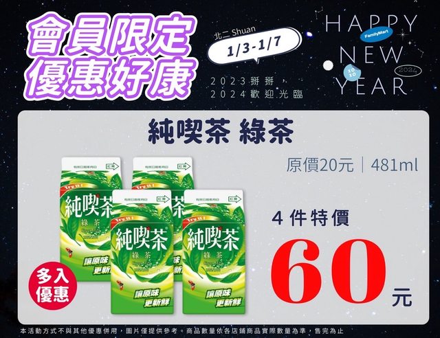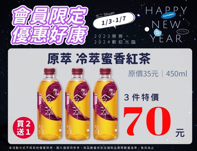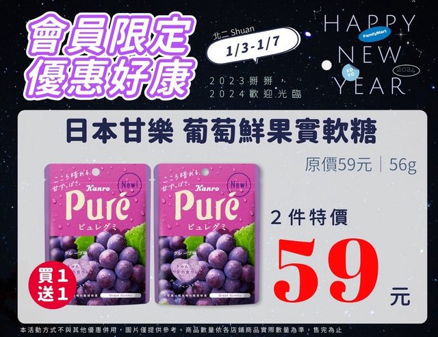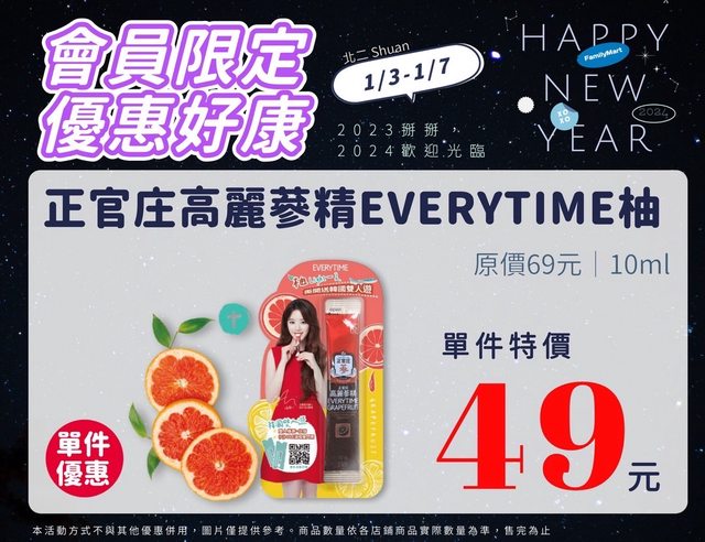 【活動名稱】:會員限時優惠 【便利商店/廠商名稱】:全家 【活動時間】:2024/01/03~2024/01/07 【活動內容】: https://i.imgur.com/JHn7Y68.jpg