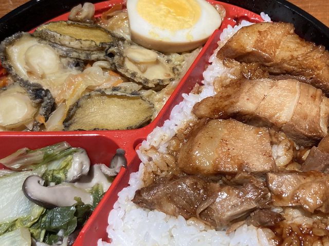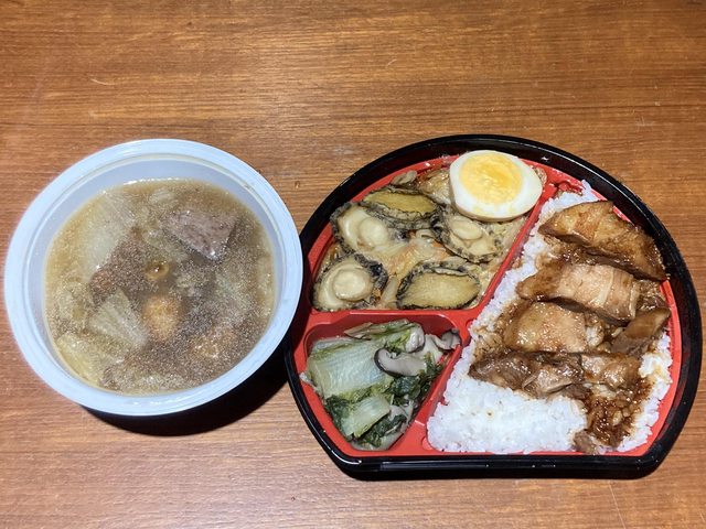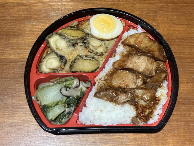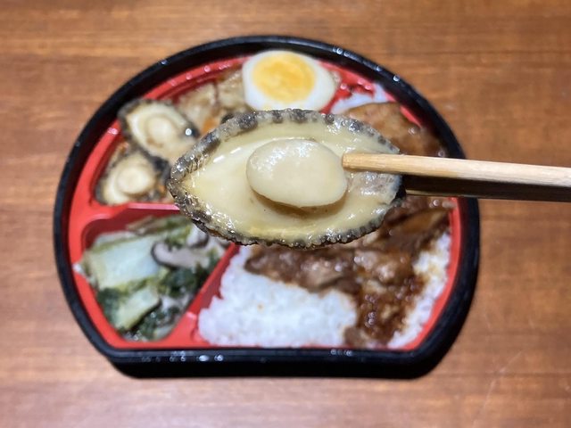 御膳的菜色有:紹興東坡肉佐配白飯.富貴鮑魚魯高麗菜.香菇炒時蔬.半份滷蛋