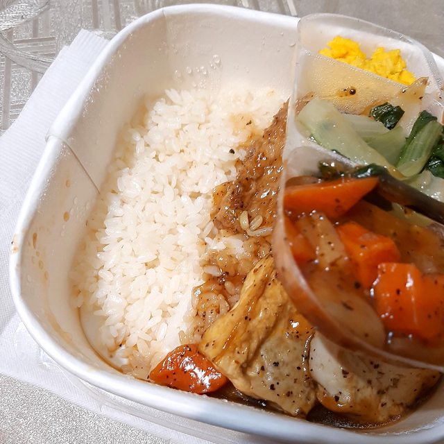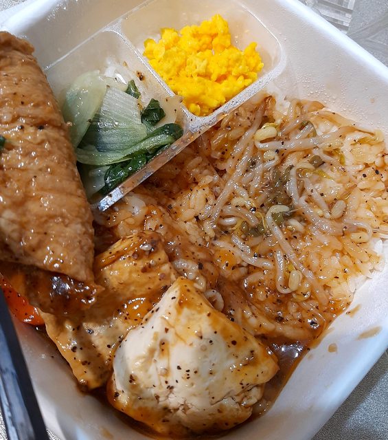 左邊菜格是兩口炒蛋、一口青江菜、兩口黑胡椒馬鈴薯紅蘿蔔。