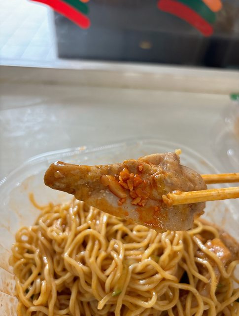 【心得】:麵體吃起來就是典型的小七涼麵,調味醬包可以想像一下真飽蒜辣涼麵,把甜味去掉80%,然後真的很鹹。至於口水雞,與其說他是口水雞,不如說他就是小七烤雞三明治的肉……可取的地方就是他肉很大塊,單純想補充蛋白質吃點麻的東西我覺得可以選,口味真的不要太期待。