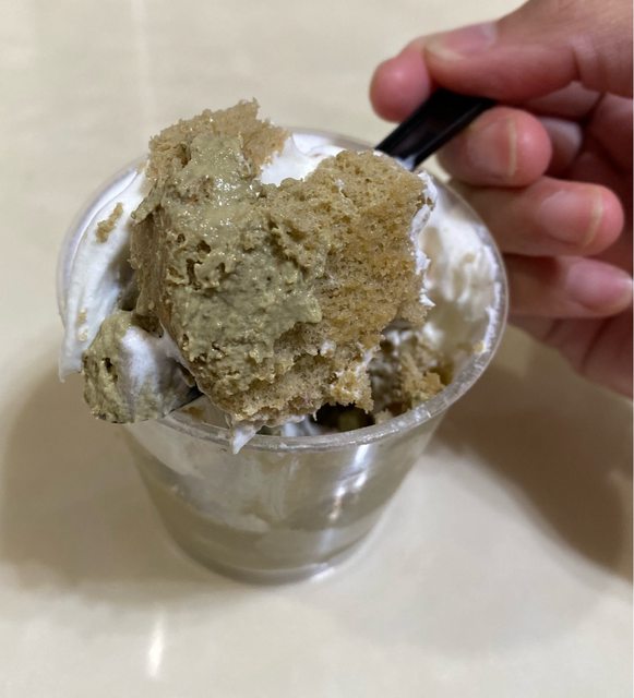 再來(2)的蛋糕體清爽中帶一點茶味清香,吃起來濕潤不乾,麻吉塊很 Q 彈!