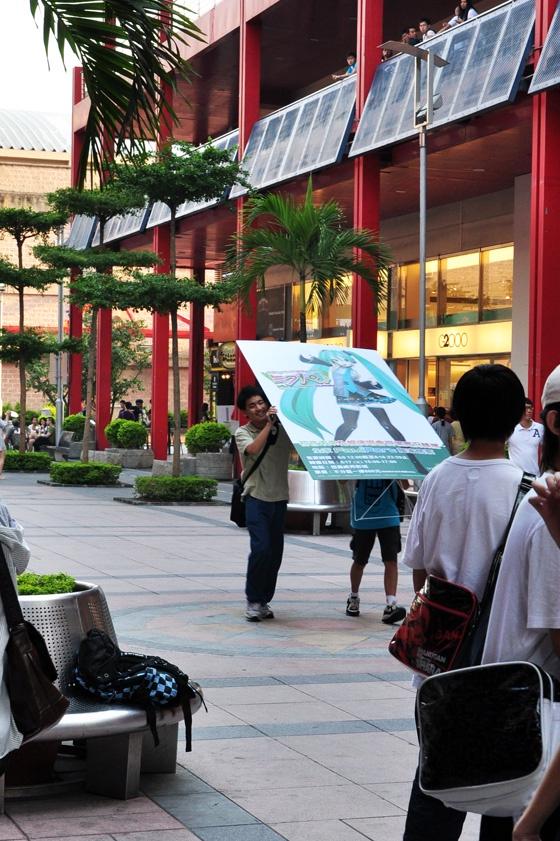 信義商圈裡,2名年輕人,合力扛著虛擬偶像初音未來的人型立牌,