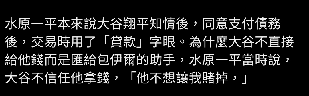 推 adwn: 錢是從大谷帳戶直接匯給賭博莊家那邊,剩下說法反而不重要 03/21 09:55