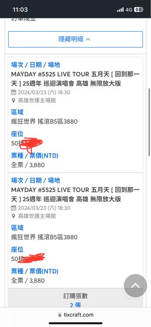 標題[售票] 3/23五月天B5區3880*2