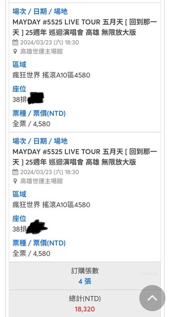 標題[售票] 五月天 3/23 A10 4580*1