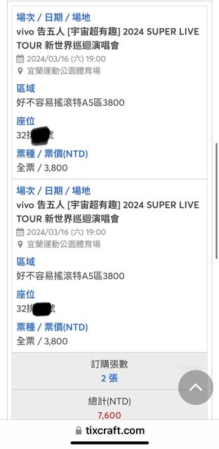 標題[售票] 降售 告五人 3/16 A5區 3000/張*2