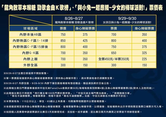 此次售票開放7/14(五)-10/15(日)中信兄弟主場賽事門票販售,將於7/3(一)中午12:30