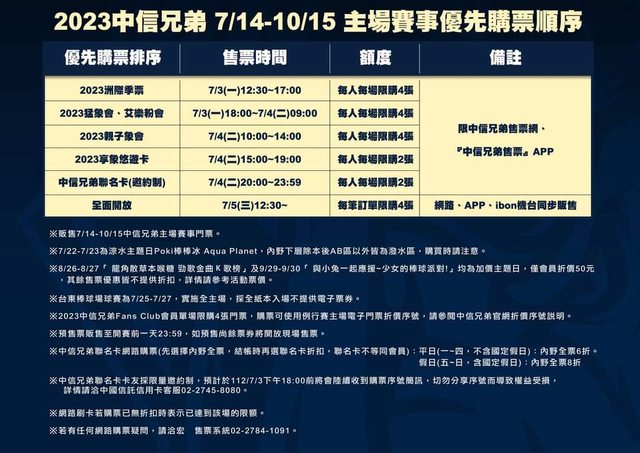 -17:00開放2023洲際季票會員,7/3(一)18:00-7/4(二)09:00開放2023猛象會員、艾樂