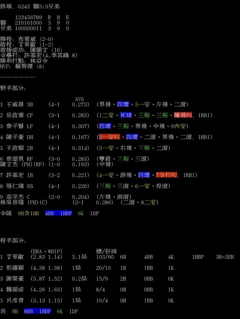 標題[情報] G243 獅5:3兄弟 全場數據box