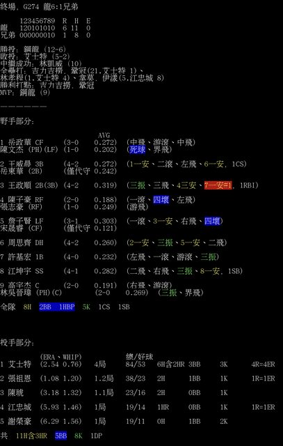 標題[情報] G274 龍6:1兄弟 全場數據box