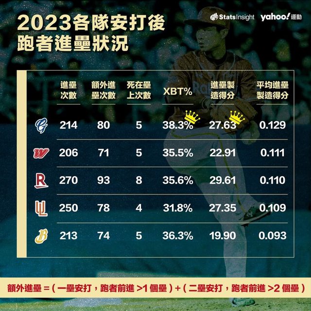 時,前進「多於一個壘」;或打者擊出二壘打時,前進「多於兩個壘」的比例。數字越高,