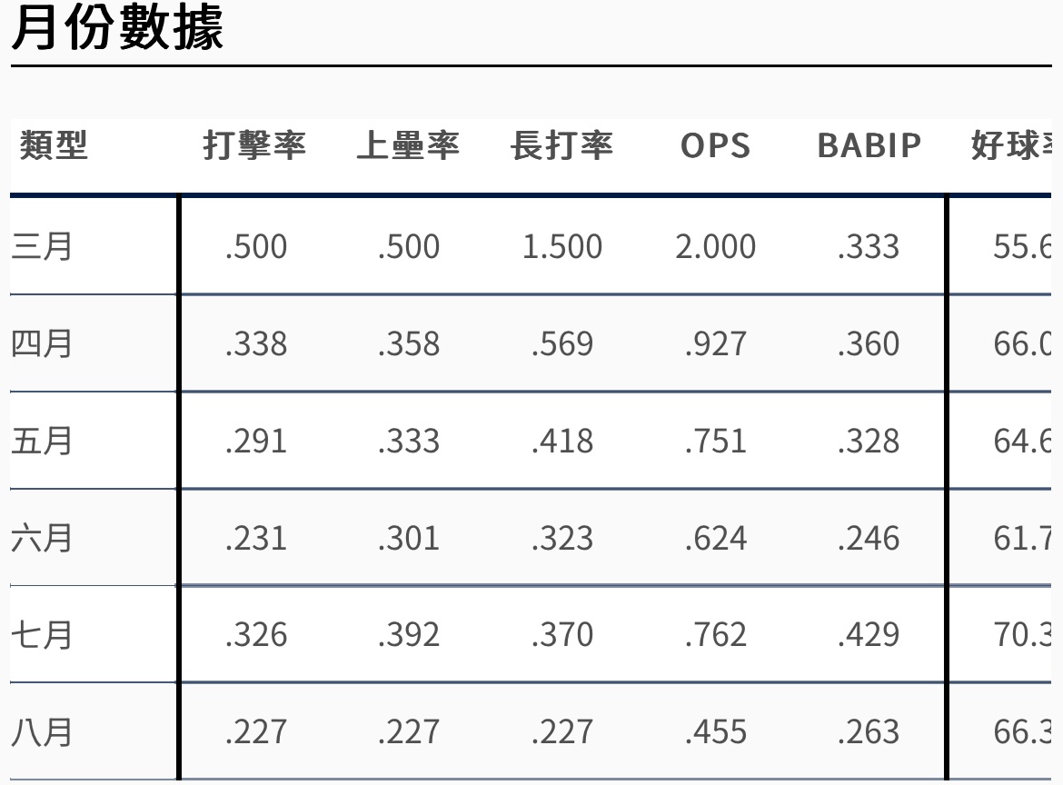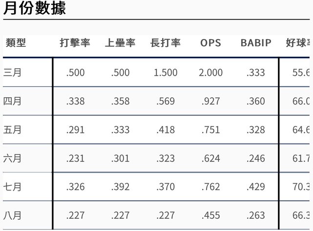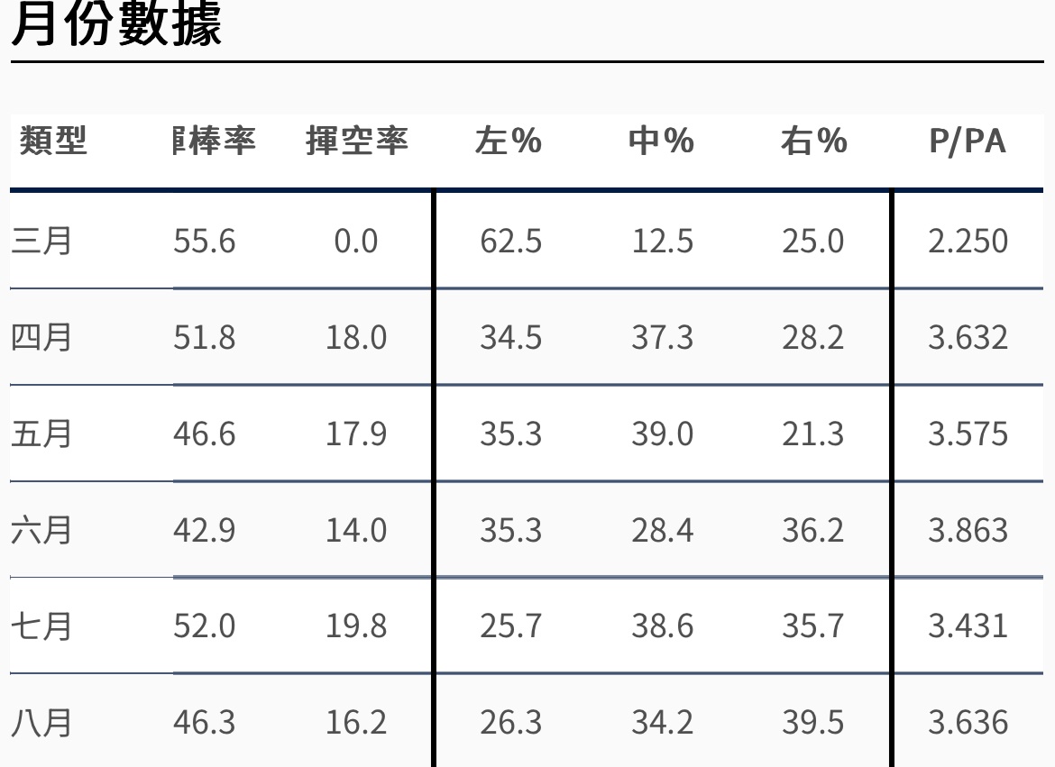 推 rod007: 他揮空率低的月份打得也比較差 選球策略跟揮擊速度讓他打 08/10 08:12