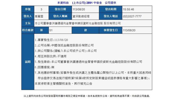 中信金在下午3點55分輸入股市觀測站,董事會決議通過向金管會申請投資新光金,中信