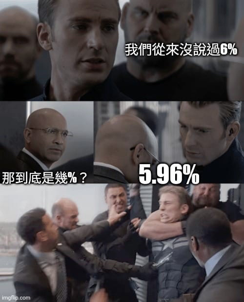 噓 joety1103: 不是讓6%是5.96%,你認真?以後還想要 61.67.248.26 11/23 10:07